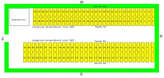 60 huurgraven liggen in twee rijen, “rei 1” oneven nummers 1 t/m 59 strak tegen de heg aan de westzijde en strak tegen de heg aan de noordzijde en “rei 2” met de even nummer 2 t/m 60 naast het middenpad van 4,1 meter breed. De lengte van de graven is twee meter, en de breedte een meter. De ruimte tussen de rijen is 0,3 meter. Tussen de heg aan de straatzijde en de huurgraven is ongeveer zes meter, deze ruimte wordt aanvankelijk gebruikt voor kindergraven.