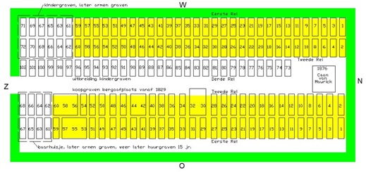 In 1876 was in het grafmonument van Marie Jan (voornaam) Caan van Maurik (achternaam) reeds begraven. De rij kindergraven nummer 73 t/m 102 lagen vanaf dit grafmonument tot aan de heg naast de toegang.